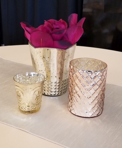 Get your eclectic vintage on with Mercury Glass votives, in 3 sizes and tones of silver, gold and rose gold/blush.